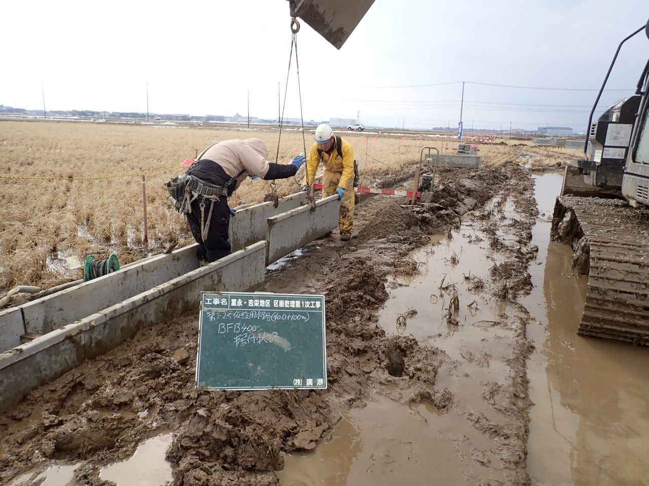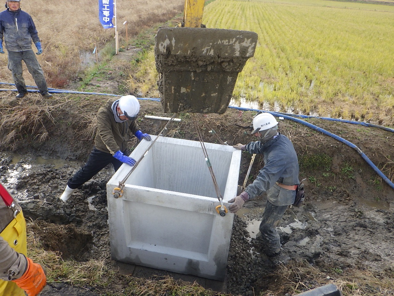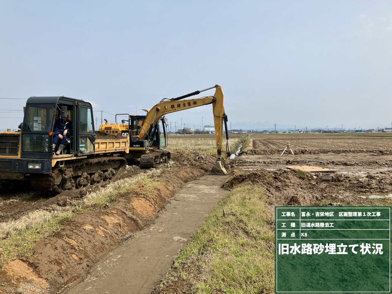 4月は用排水路のフリューム・桝の据付、排水横断工の施工、並行して旧水路埋立、法面整形を行いました。