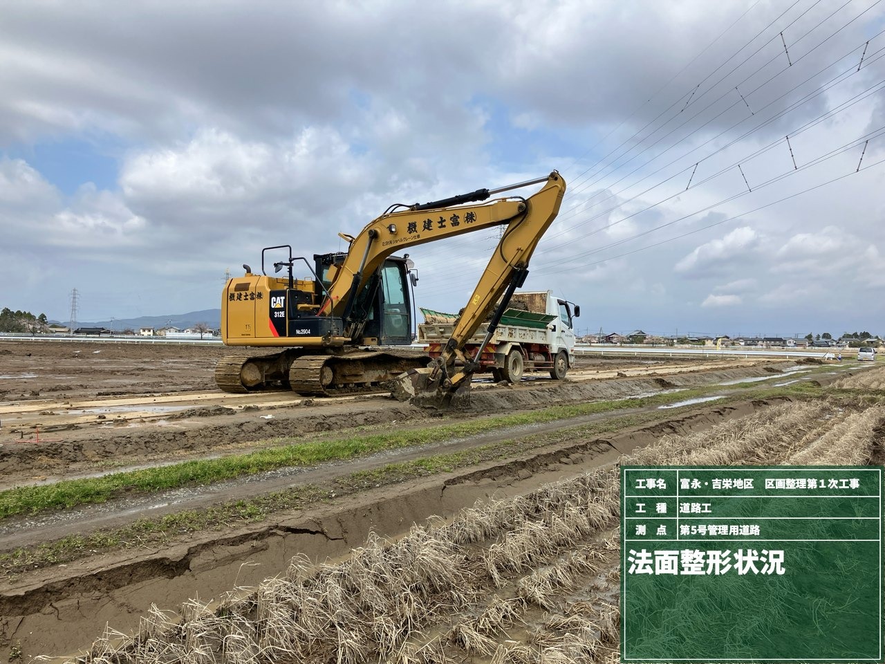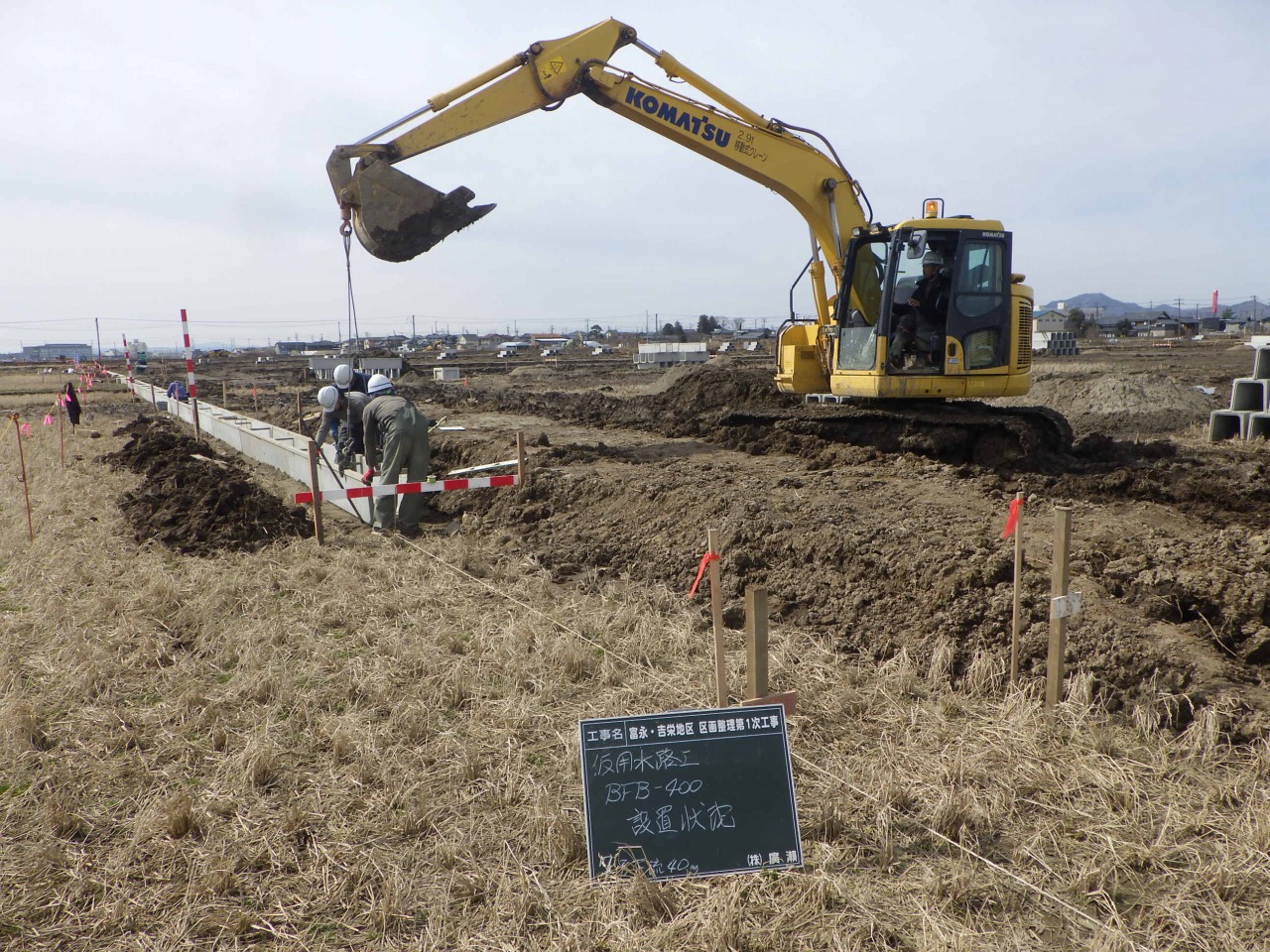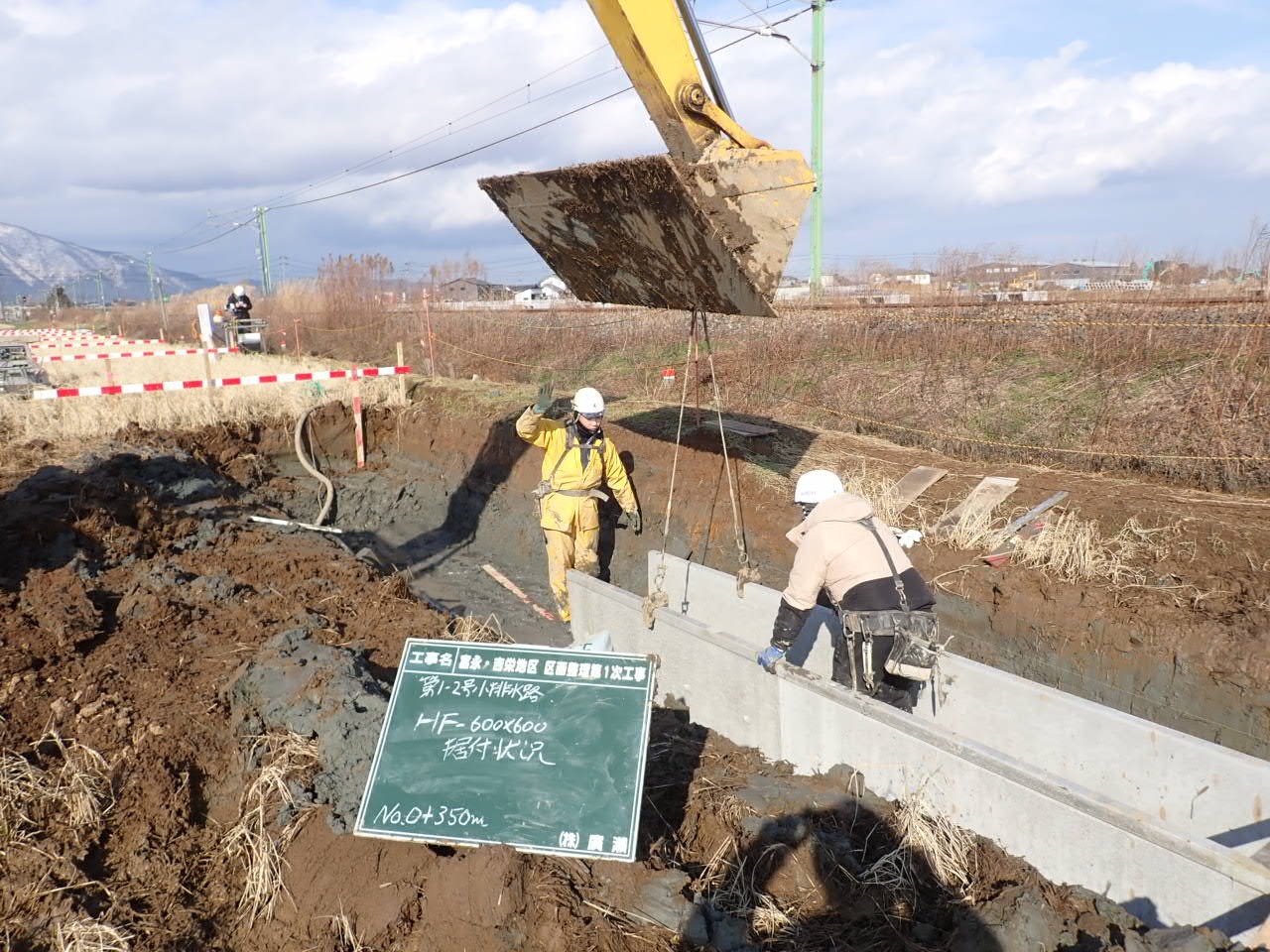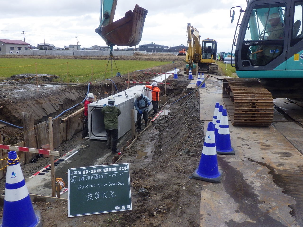 4月は用排水路のフリューム・桝の据付、排水横断工の施工、並行して旧水路埋立、法面整形を行いました。