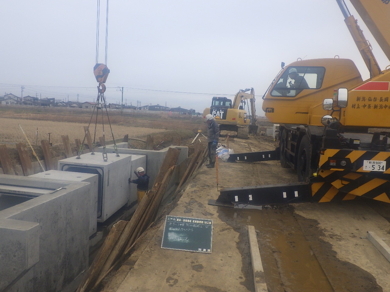 3月も引き続き管水路工、排水横断工のボックス据付、並行して仮設水路のフリューム据付、旧道路撤去及び道路盛土を行いました。